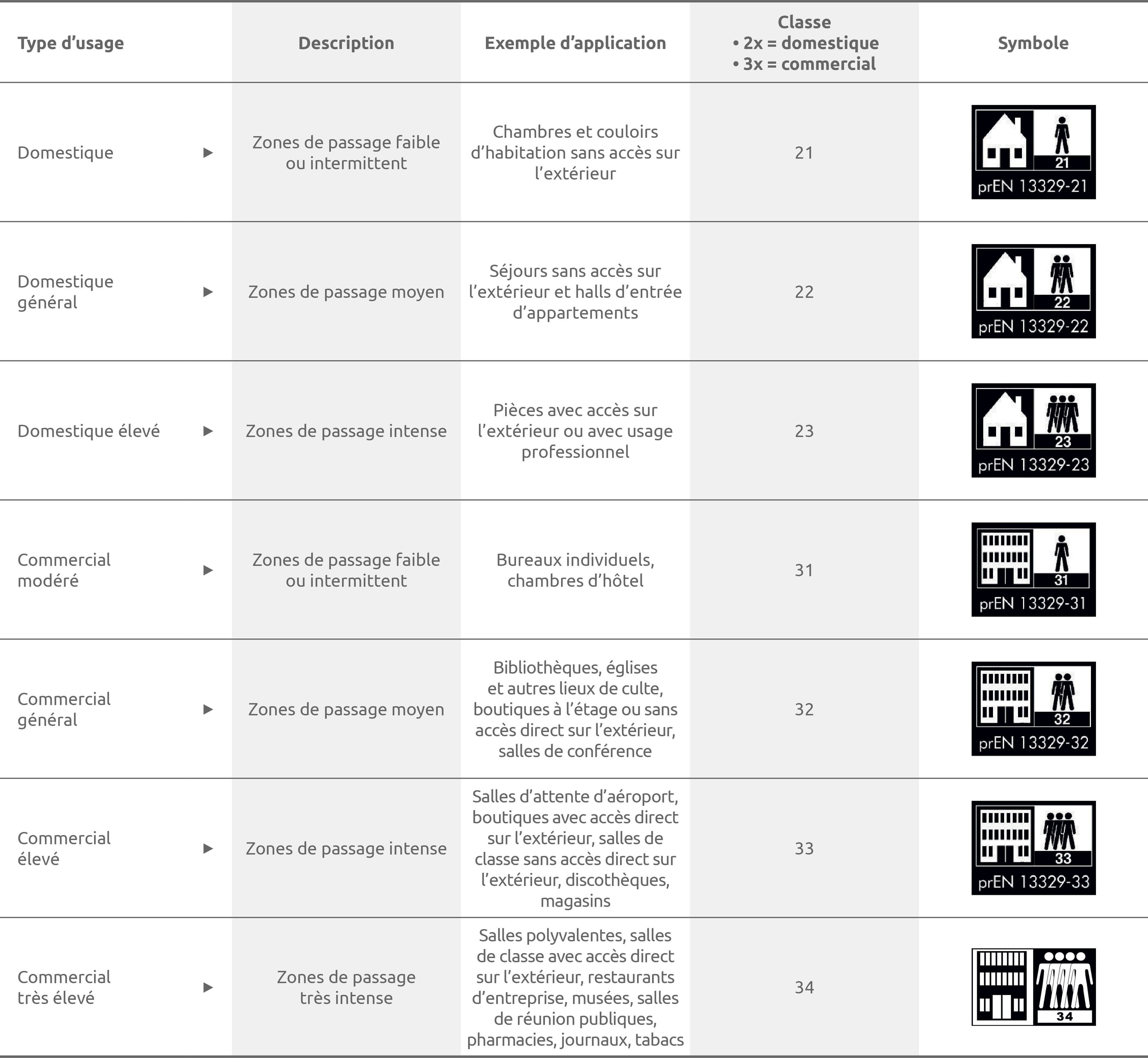 Cette norme classe les revêtements de sol selon leur intensité d’usage :