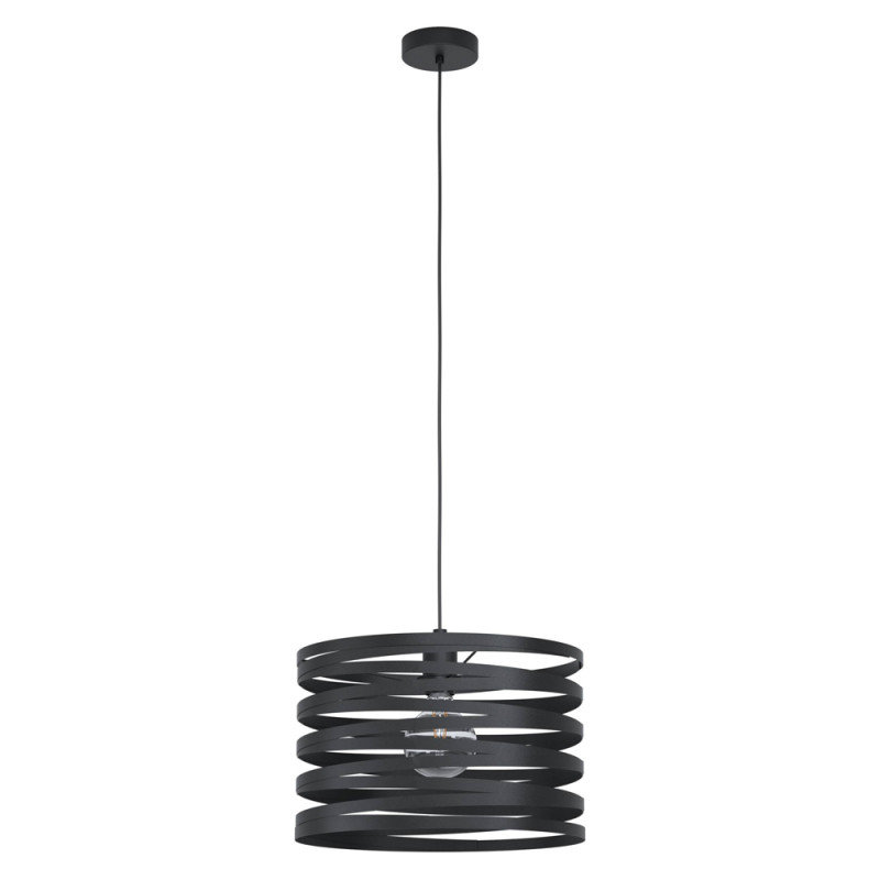 Cette suspension Cremella de la marque Eglo est constituée d'un abat-jour rond en métal noir. Les fines bandes de métal disposées en spirale créent un magnifique jeu de lumière et d'ombre sur le mur dès que la lampe est allumée.