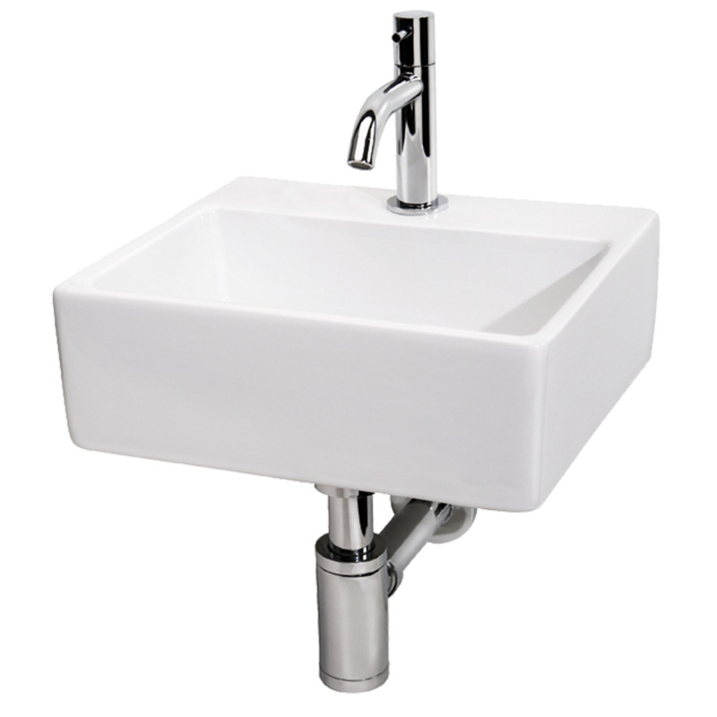 Lave-mains Differnz Brimo, appropriée pour presque toutes les toilettes. La fontaine peut se placer seulement avec le robinet en avant. La fontaine en céramique complet, mitigeur l'eau froide, tuyau d'évacuation et siphon. Points de fixation invisible.