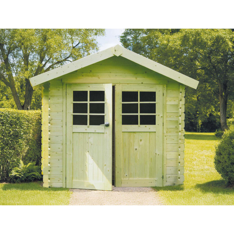 Cet abri de jardin en bois massif de 28 mm offre une surface utile de 5,88 m². Sa double porte vitrée avec serrure et sa toiture double pente assurent un accès pratique et une protection durable.