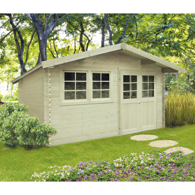 Cet abri de jardin en bois massif de 28 mm offre une surface utile de 14,37 m² pour un rangement spacieux. Sa structure en sapin du Nord traité autoclave et sa toiture double pente avec feutre assurent une protection durable, tandis que son montage par emboîtement facilite l'installation.