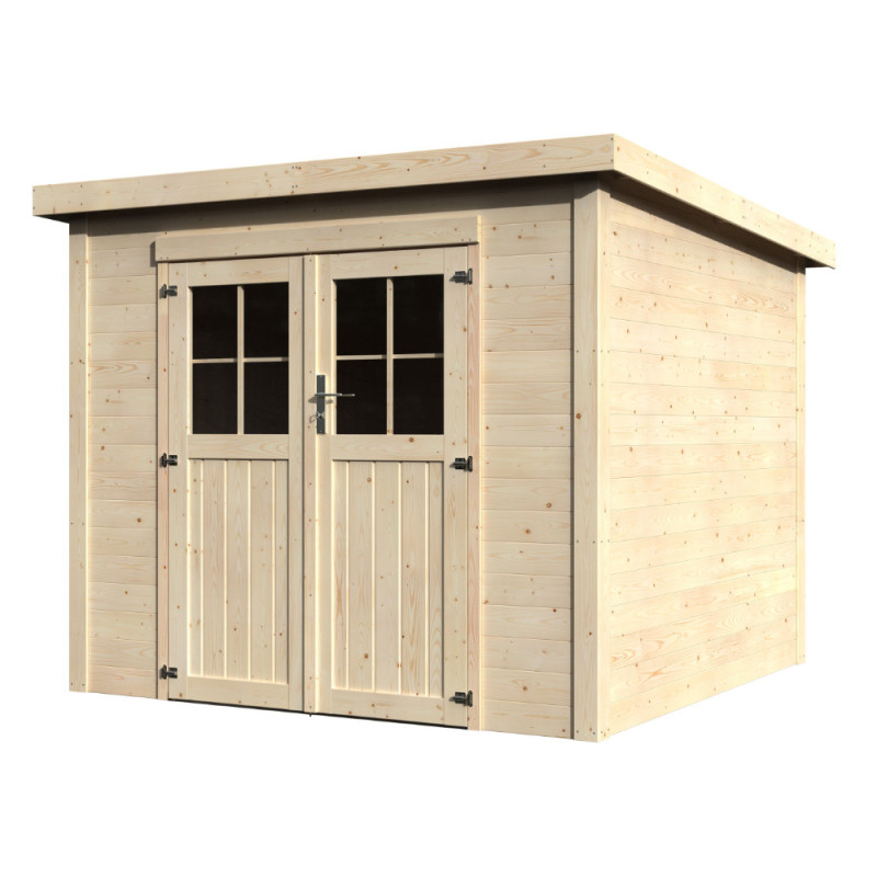 L'abri de jardin en bois Talion constitue une solution de stockage pérenne et esthétique. Sa structure en madriers de sapin blanc du Nord d'une épaisseur de 19 mm offre une robustesse notable pour protéger vos équipements toute l'année.