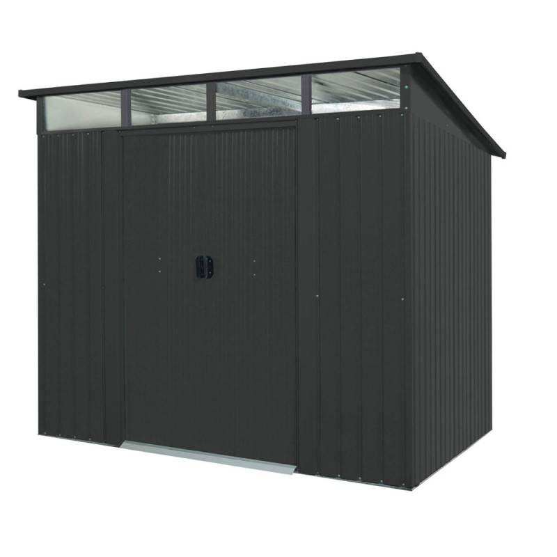 La structure est réalisée en tôle d'acier électro-galvanisée et peinte, assurant une résistance aux intempéries. Le toit en appentis favorise l'écoulement des eaux de pluie. L'ensemble est conçu pour être monté par l'utilisateur sur une fondation préparée aux dimensions de 1,84 x 1,1 m, permettant une installation adaptée au terrain.