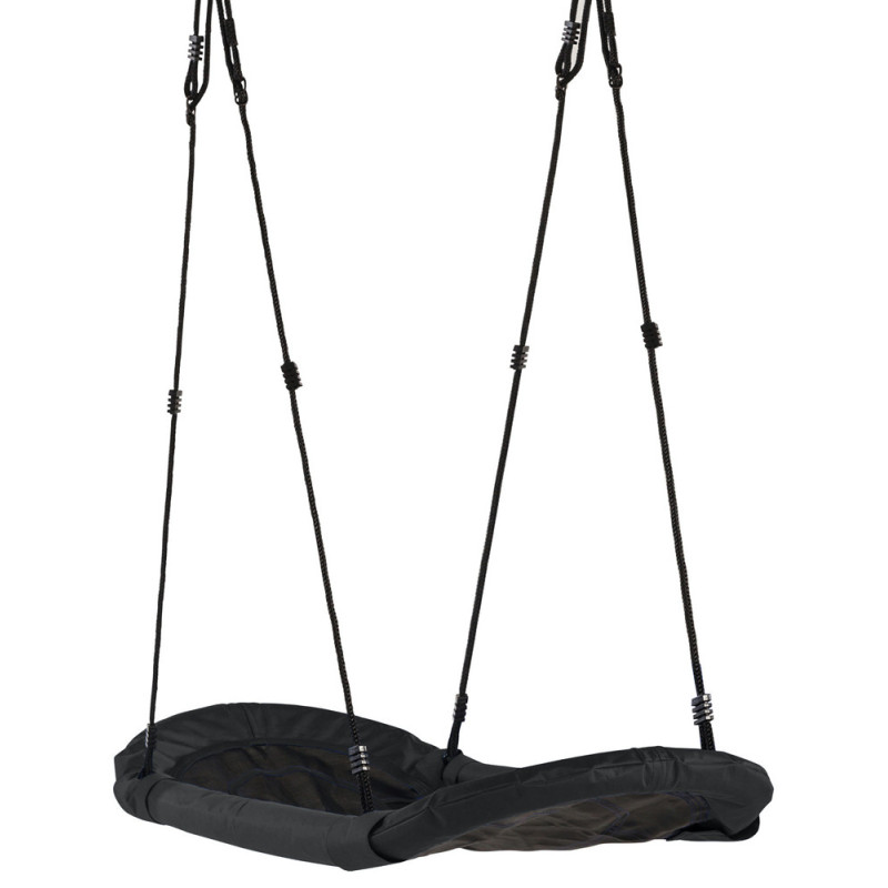 Le siège de balançoire nid Sampa présente une structure en métal protégée par de la mousse et une toile noire résistante. Ce modèle, adapté aux enfants de 3 à 13 ans, supporte un poids maximal de 100 kg pour un usage familial.