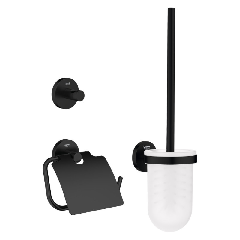 L'ensemble d'accessoires de toilette GROHE Start en noir mat réunit un porte-rouleau, une brosse et un crochet pour une salle de bains cohérente. Son montage caché et sa finition durable assurent une installation professionnelle et un entretien simplifié.