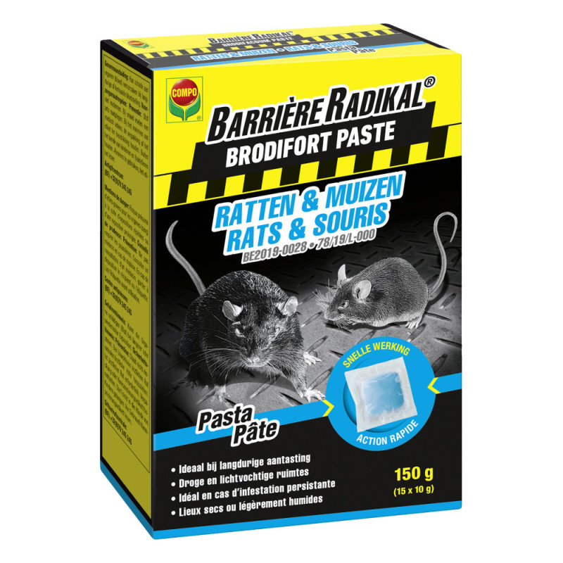 La pâte Barrière Radikal Brodifort est un appât conçu pour la lutte contre les rats et les souris dans et autour des bâtiments. Ce produit de la marque Compo est présenté sous forme de pâte, conditionnée en 15 unités pour une application facilitée sur plusieurs points stratégiques.