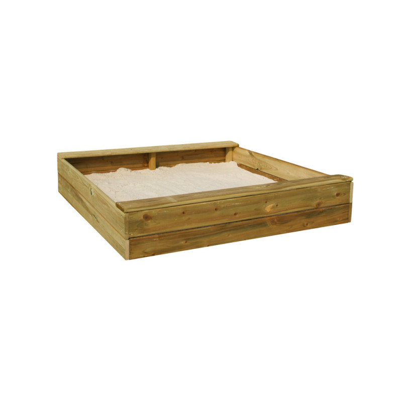 Le bac à sable 100 x 100 cm en bois certifié PEFC offre une aire de jeu spacieuse pour les enfants jusqu'à 13 ans. Sa construction en pin et épicéa traité en autoclave garantit une grande durabilité en extérieur.