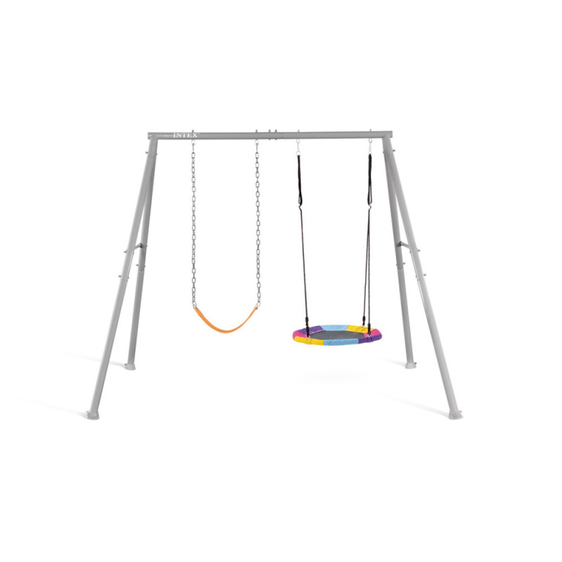 Le portique en métal Swingset Intex est un ensemble de balançoire à deux agrès avec une conception de cadre en A robuste en acier. Il comprend une balançoire à chaîne et une soucoupe octogonale de 81 cm d'une capacité de 100 kg, adapté pour un usage par jusqu'à trois enfants âgés de 3 à 10 ans.