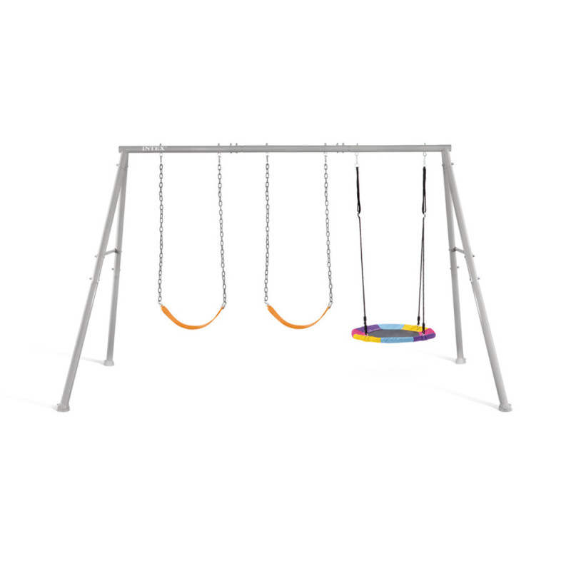 Le portique en métal Swingset de la marque Intex constitue une aire de jeux extérieure complète et robuste. Son cadre en A en acier assure une stabilité optimale pour des heures de divertissement en toute sécurité. Conçu pour les enfants âgés de 3 à 10 ans, il offre un espace de jeu adapté à leur développement moteur.