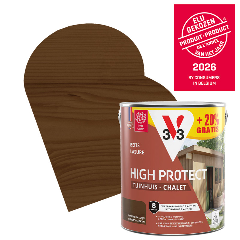 Contenue dans un récipient de 3 L, la lasure High Protect de la marque V33 présente une finition chêne foncé à la texture satinée qui sublimera votre chalet de jardin. Ce produit vous assure également une protection optimale face aux agressions climatiques et aux rayons UV, peu importe la saison.