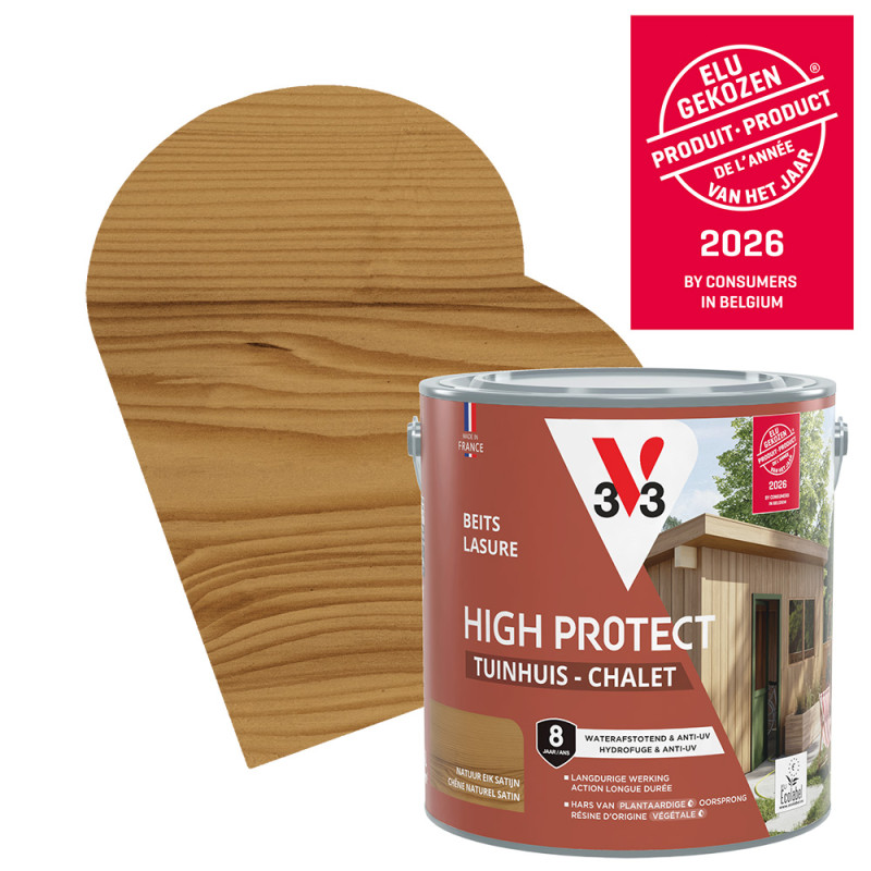 Affichant une finition satinée couleur chêne naturel, la lasure High Protect de la marque V33 bénéficie d'une texture anti-goutte qui vous promet une application facile. Ce produit est contenu dans un pot de 2,5 L et protège durablement vos bois extérieurs contre les UV, la pluie et le gel.