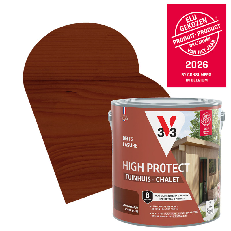Affichant une finition satinée couleur acajou, la lasure High Protect de la marque V33 bénéficie d'une texture anti-goutte qui vous promet une application facile. Ce produit est contenu dans un pot de 2,5 L et protège durablement vos bois extérieurs contre les UV, la pluie et le gel.