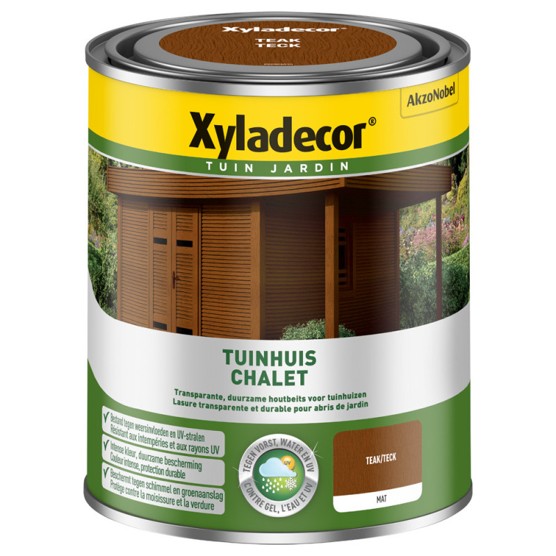 La lasure pour bois Chalet teck de la marque Xyladecor, contenue dans un pot de 0,75 L, protège durablement les abris de jardin. Elle pénètre en profondeur, régule l'humidité et résiste aux intempéries, UV, moisissures et algues.