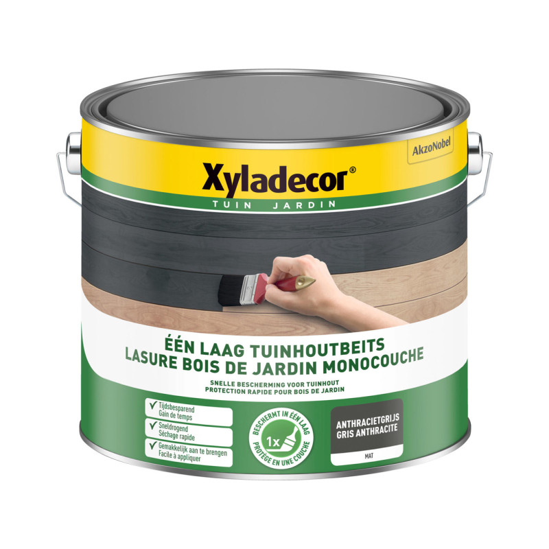La lasure pour bois de jardin monocouche de la marque Xyladecor, de couleur gris anthracite, est idéale pour le bois extérieur. Sa formule liquide assure un séchage rapide en 4h et un rendement de 6 m²/L.