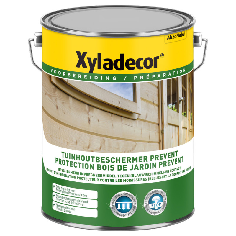 La protection pour bois Prevent de la marque Xyladecor est un primaire aqueux pour bois de jardin, protégeant contre moisissure et pourriture. Elle pénètre profondément, est sans odeur et s'applique à la brosse ou au pistolet, offrant un rendement de 10 m²/L.