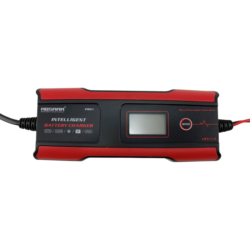 Le chargeur pour batterie de voiture Pro 1.0 de la marque Absaar, fabriqué en plastique, gère les batteries 6V et 12V plomb-acide, AGM et Gel via un algorithme en 11 étapes. Son écran LCD affiche l'état de la charge, qui est sécurisée contre les inversions de polarité et les surchauffes.