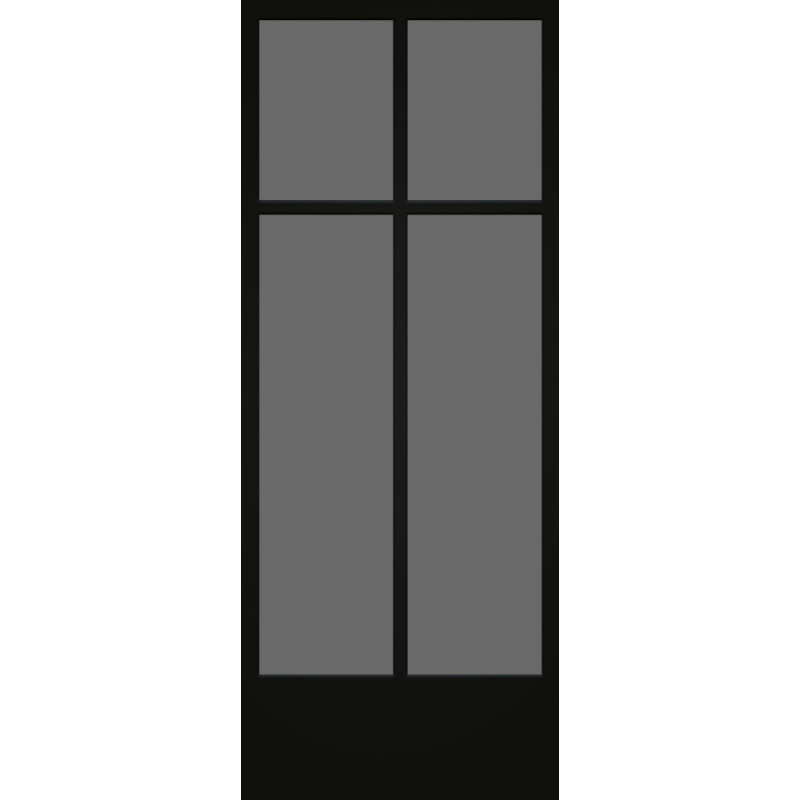 Cette porte vitrée THYS en mélamine noir mat intègre un verre trempé gris fumé de 8 mm. Ses dimensions de 78 x 201,5 cm et sa structure en bois lui confèrent un look contemporain adapté aux intérieurs modernes.