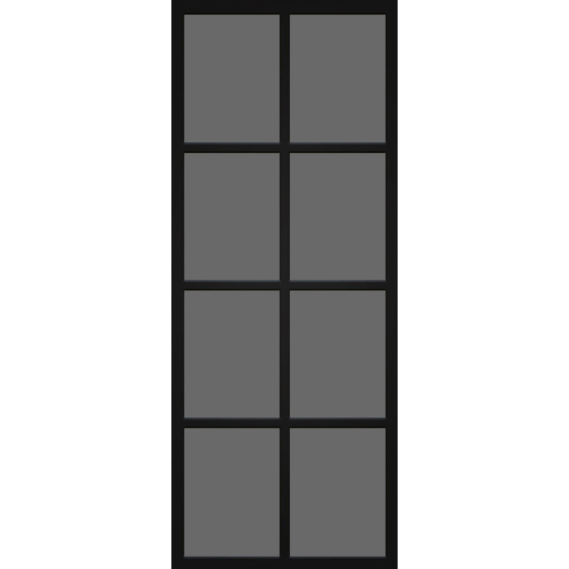 Cette porte vitrée Bloc-porte THYS en mélamine noir mat intègre un verre trempé gris fumé de 8 mm d'épaisseur. Ses dimensions de 73 x 201,5 cm et sa structure de 40 mm d'épaisseur confèrent une esthétique contemporaine et robuste.