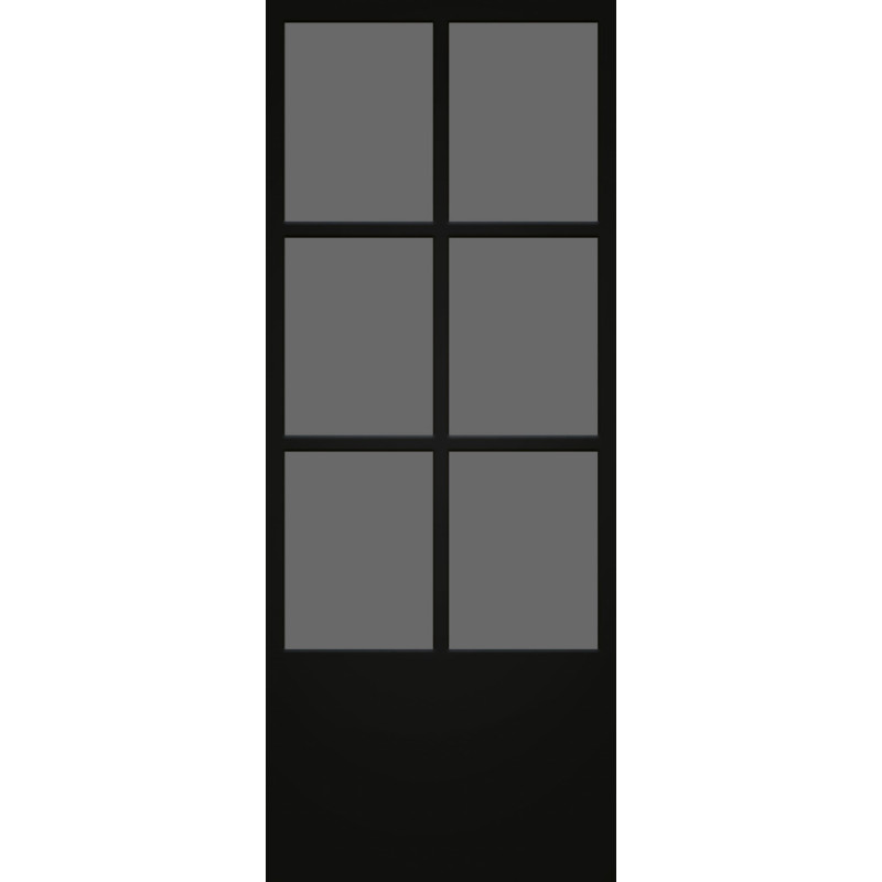 Cette porte vitrée au Steel Look noir mat intègre un verre gris fumé trempé de 8 mm pour une sécurité accrue. Ses dimensions de 63 x 201,5 cm et sa structure en bois la destinent à une installation en bloc-porte contemporain.