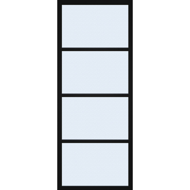 Cette porte vitrée THYS de 78 x 201,5 cm associe un verre trempé mat de 8 mm à un habillage Steel Look noir mat en mélamine. Son montage en bloc-porte complet avec chambranles et charnières noires offre une installation facilitée pour un rendu contemporain.