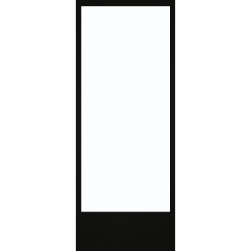 Cette porte vitrée THYS en mélamine noir mat intègre un verre trempé clair de 8 mm d'épaisseur pour une sécurité accrue. Son design contemporain Steel Look est complété par des accessoires noirs et une structure en bois pour une installation en bloc-porte.