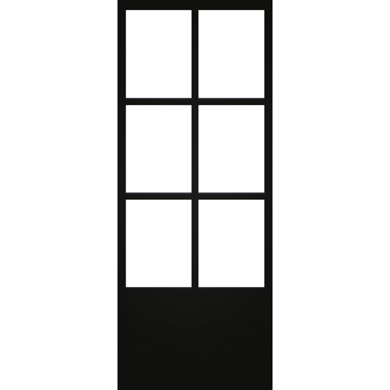 Cette porte vitrée bloc-porte THYS, d'un format de 63 x 201,5 cm, présente un Steel Look noir mat contemporain. Sa structure associe un panneau en mélamine à un verre trempé clair de 8 mm d'épaisseur, pour une intégration harmonieuse.