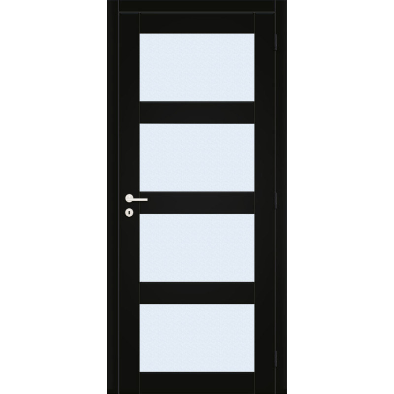 Le bloc-porte combine des matériaux solides pour une utilisation intensive. Son aspect noir mat s'harmonise avec une large palette de décors, des intérieurs industriels aux ambiances minimalistes. La surface du verre mat filtre la lumière pour créer une atmosphère douce et apaisante dans la pièce.