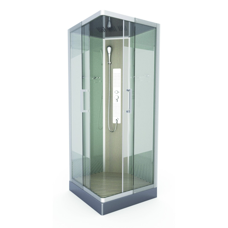 Cette cabine carrée a des dimensions de 90 x 90 x 215 cm. Elle est composée d'une colonne, d'un caillebotis en bois composite avec plaque inox couleur chêne naturel, d'un toit, d'un receveur en acrylique gris renforcé, d'une fermeture magnétique et de poignées en inox chromé.