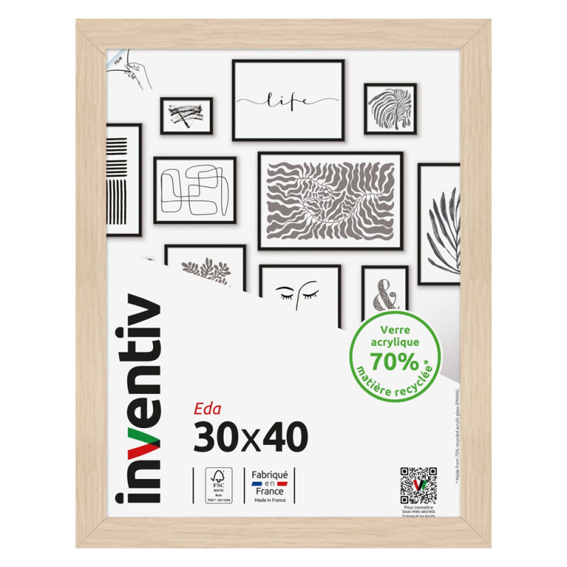 Ce cadre décoratif Inventiv, de format 30 x 40 cm, est conçu en bois massif FSC couleur naturelle. Son verre acrylique recyclé et léger protège vos photos, tandis que son système d'accroche permet une fixation murale en position horizontale ou verticale.
