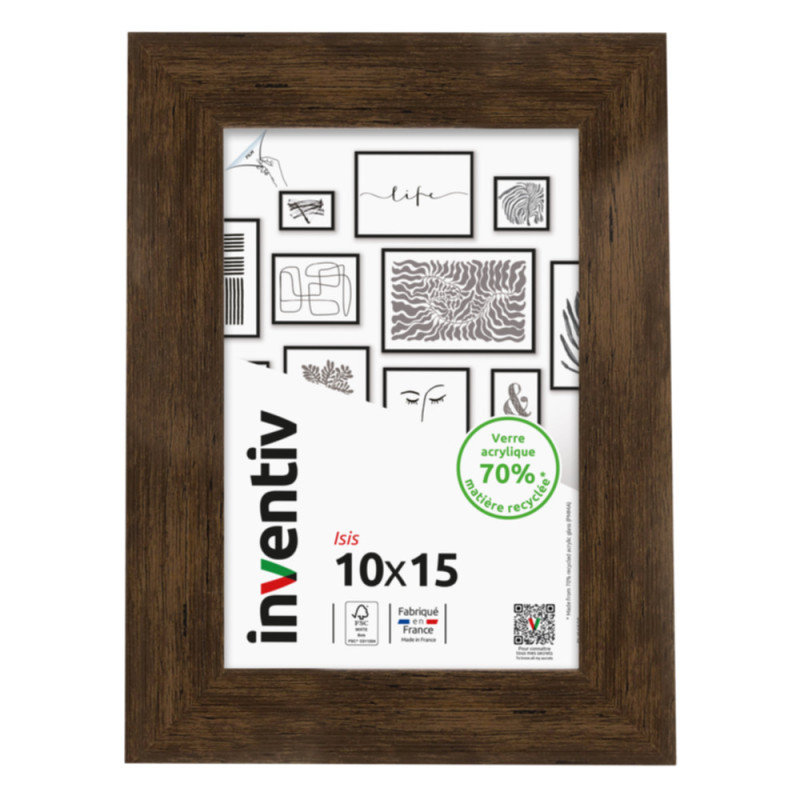 Le cadre Isis ébène 10 x 15 cm d'INVENTIV, en bois massif, présente une compatibilité avec les formats horizontaux ou verticaux. Sa conception française intègre un verre acrylique majoritairement recyclé et offre une double option de pose, murale ou sur meuble.