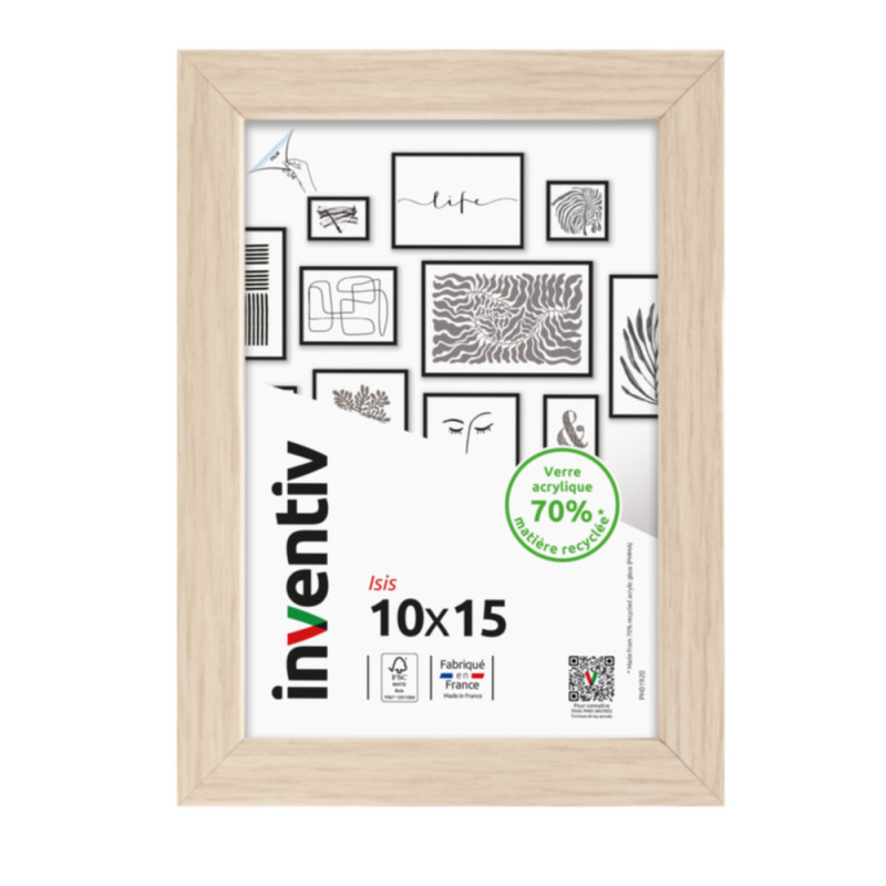 Le cadre Isis naturel Inventiv, fabriqué en France en bois massif, présente un format 13 x 18 cm. Son verre acrylique recyclé et résistant protège la photo, tandis que sa conception permet une pose au mur ou debout pour une décoration intérieure élégante.