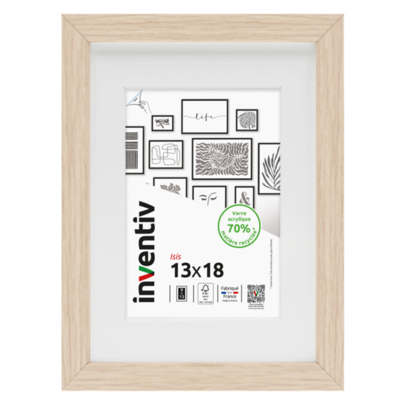Le cadre Isis naturel Inventiv, en bois massif fabriqué en France, présente un format 18 x 24 cm. Son verre acrylique recyclé protège la photo, tandis que son système d'accroche permet une pose murale ou sur meuble.