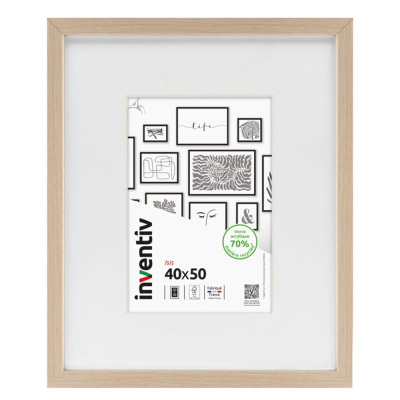 Le cadre Isis naturel 50 x 70 cm INVENTIV, fabriqué en France en bois massif, présente un système d'accroche pour une fixation murale. Son verre acrylique recyclé et résistant protège les photos dans une esthétique minimaliste pour la décoration intérieure.