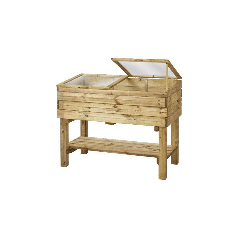 Ce carré potager sur pieds de 120 x 60 x 90 cm est idéal pour cultiver légumes et plantes aromatiques. Fabriqué en bois de pin certifié FSC et imprégné, il résiste aux intempéries. Il inclut une petite serre pour favoriser la croissance de vos plantations.