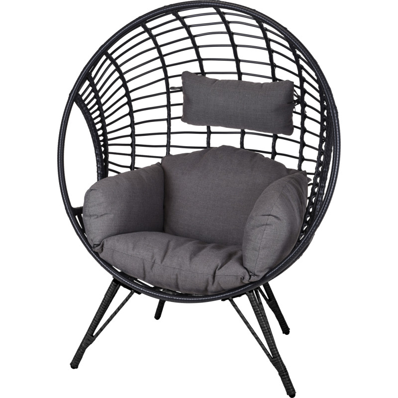 Ce Fauteuil rond en métal, d'une largeur de 106 cm et d'une hauteur totale de 132 cm, allie esthétique et fonctionnalité. Sa structure en métal noir, associée au rotin noir, lui confère une allure moderne et sophistiquée. Ce fauteuil est conçu pour s'intégrer harmonieusement aussi bien dans un environnement extérieur, comme une terrasse ou un jardin, que dans un espace intérieur, apportant une touche de caractère à votre décoration.