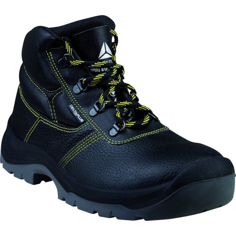 La paire de chaussures de sécurité haute Jumper 3 S1P de la marque Delta Plus offre une construction robuste en cuir croupon avec un embout et un insert anti-perforation en acier inoxydable. Sa semelle injectée en PU et sa doublure textile assurent un usage durable et protecteur.
