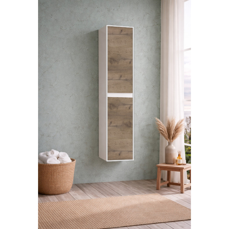 Ce type de colonne de salle de bain trouve sa place en complément d'un meuble vasque ou en tant qu'élément de rangement autonome. Ses dimensions de 160 cm de hauteur et 30 cm de profondeur en font un compagnon idéal pour les espaces étroits comme les couloirs de distribution ou les toilettes. L'assemblage des teintes bois et blanc lui permet de s'adapter à une large palette de décors, des plus classiques aux plus contemporains.