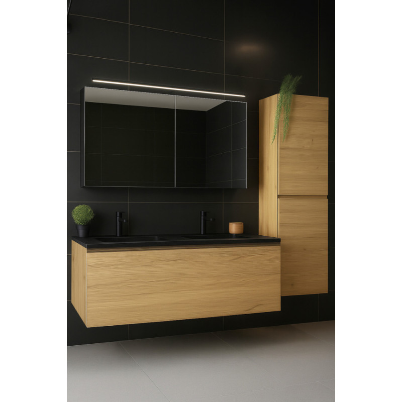 La colonne de salle de bain Trendline THYS, d'une largeur de 40 cm, exploite l'espace vertical avec ses deux portes et sa tablette intérieure. Sa finition en chêne naturel mélaminé et son système de fermeture progressive assurent une intégration esthétique et une utilisation durable.