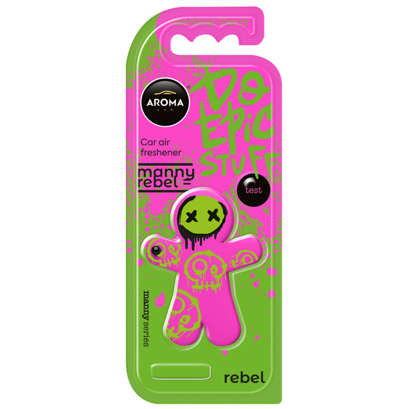 Le désodorisant pour voiture Manny Rebel Sparkling Cherry de la marque Aroma Car, en polymère synthétique, diffuse un parfum intense de cerise fraîche et fruitée. Son design décoratif rose et vert se fixe sur la grille de ventilation pour une efficacité prolongée jusqu'à 40 jours.