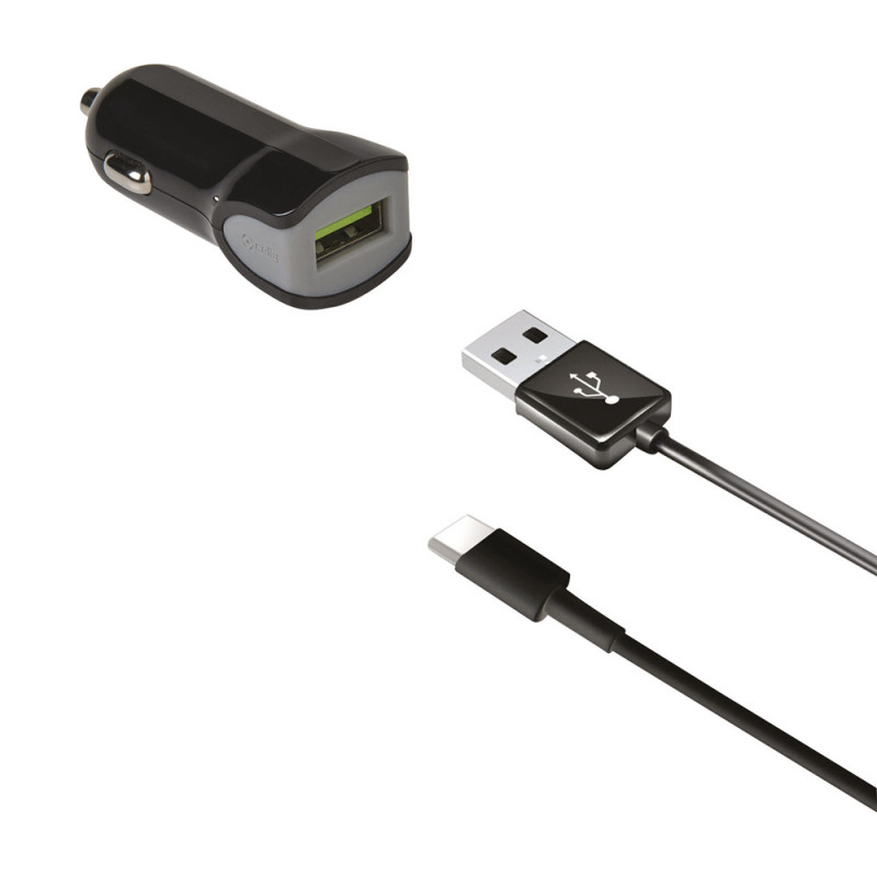 Ce chargeur pour voiture de la marque Celly, de couleur noire, offre une puissance de sortie de 2,4 A pour une recharge rapide. Son format compact et léger, associé à un câble intégré USB vers USB-C, en fait un accessoire pratique pour le véhicule.