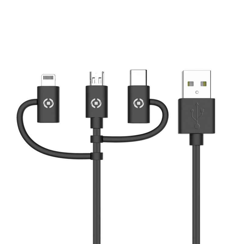 Ce câble universel 3-en-1 de la marque Celly, d'une longueur de 1 m, intègre un connecteur principal Micro USB ainsi que des embouts Lightning et USB-C. Sa conception permet de charger plusieurs appareils avec un seul accessoire, optimisant ainsi le confort dans le véhicule.