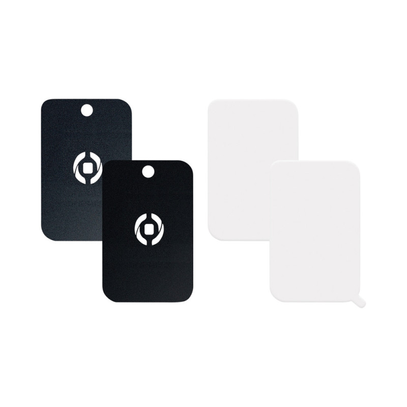 Ces deux plaques métalliques adhésives de la marque Celly assurent une fixation universelle sur les supports magnétiques Celly Ghost Technology. Le kit inclut des films transparents protecteurs pour une utilisation optimale en voiture.