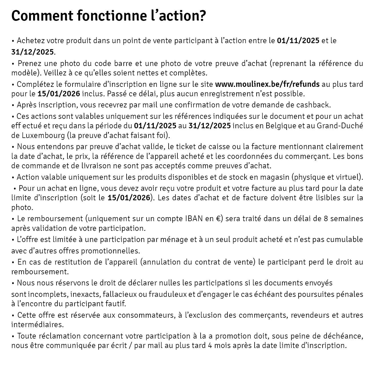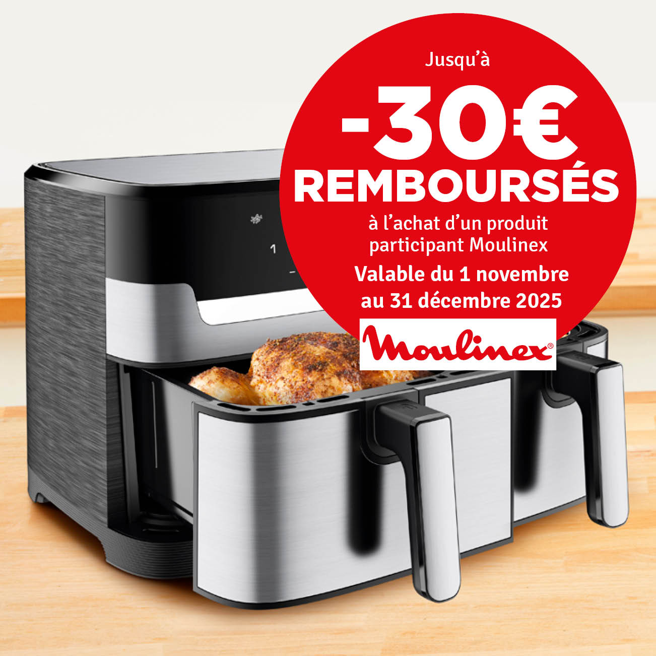Recevez jusqu'à 30€ remboursés* à l'achat d'un produit de la marque Moulinex participant. Action valable jusqu'au 31/12/2025. Enregistrez-vous au plus tard le 15/01/2026.