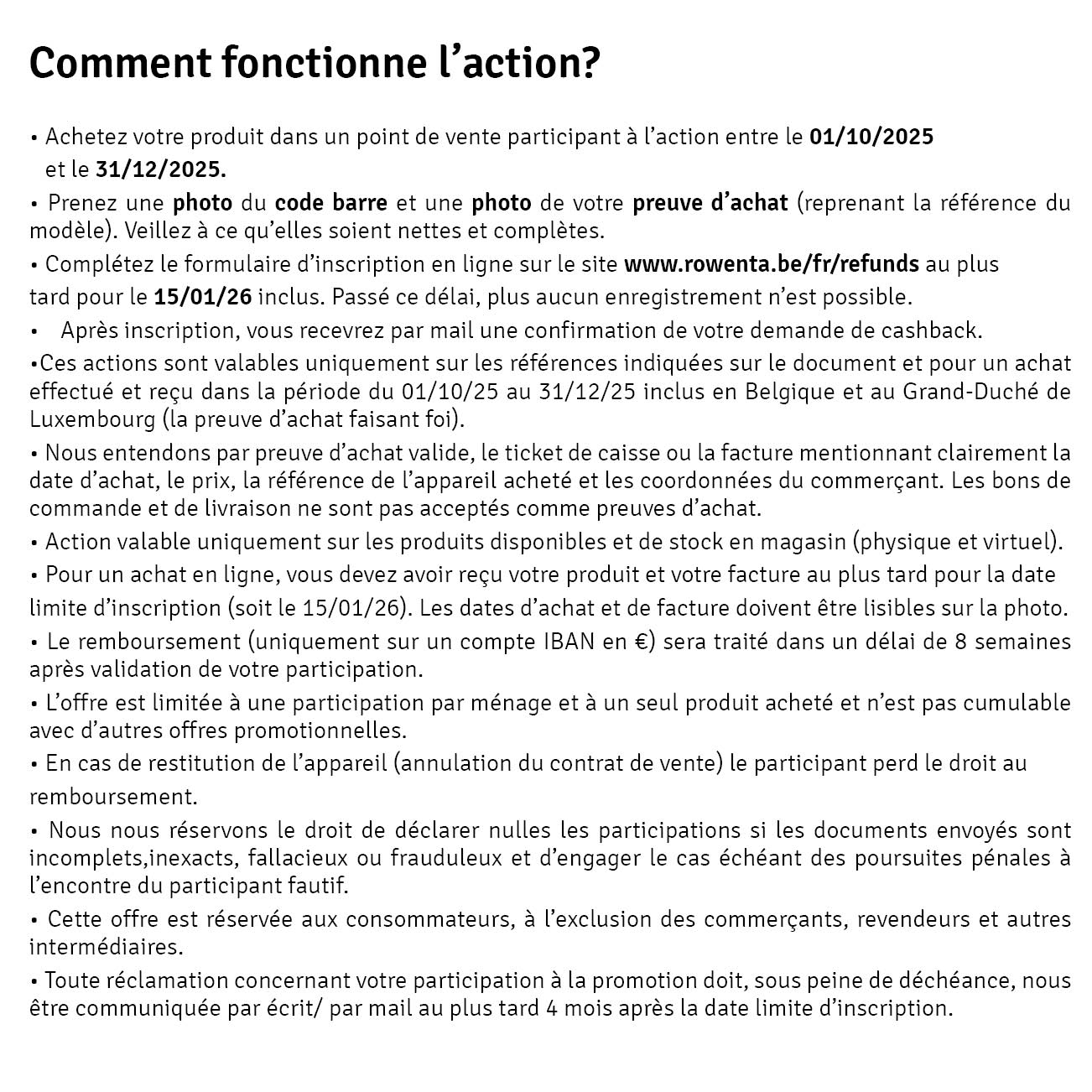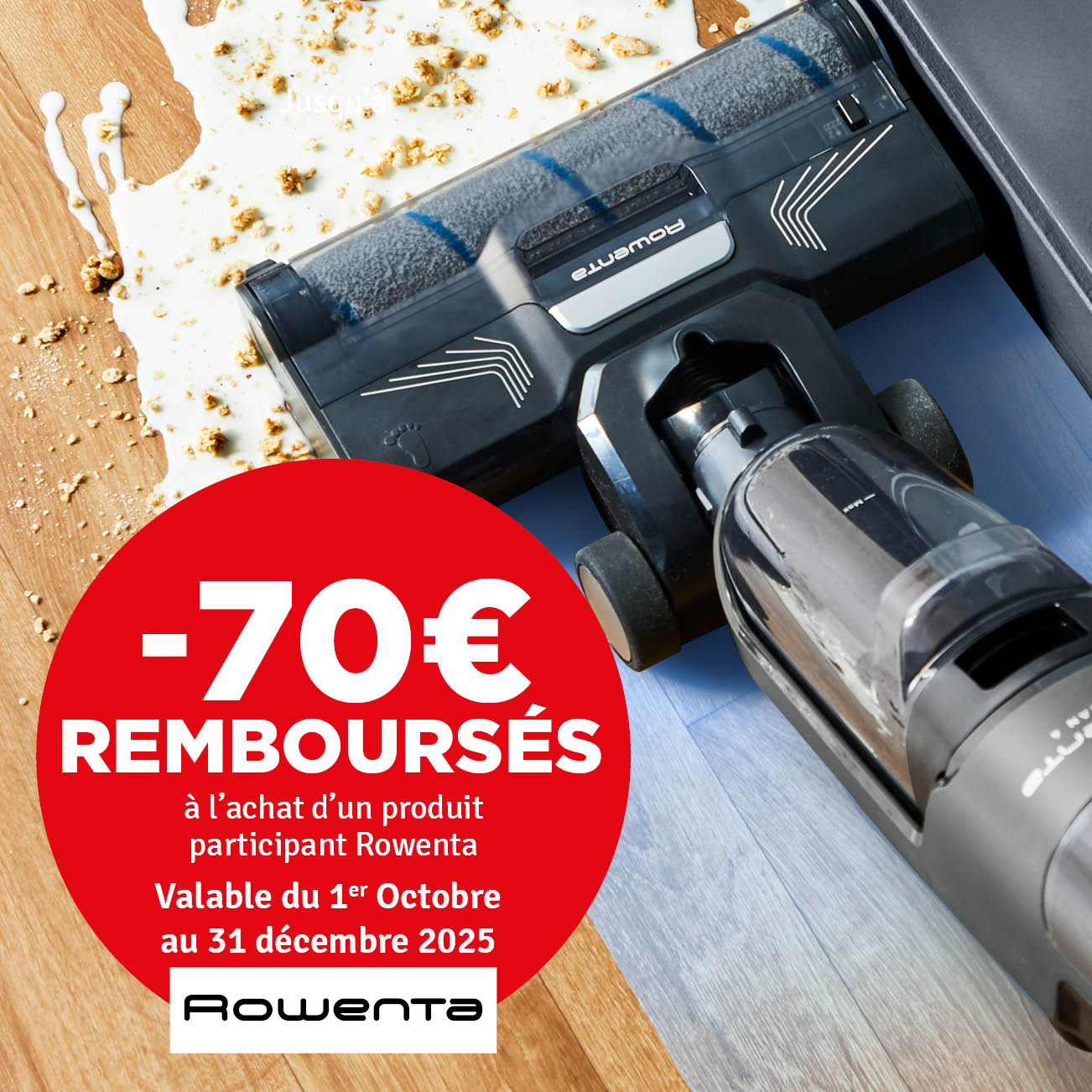 Recevez jusqu'à 70€ remboursés* à l'achat d'un aspirateur de la marque Rowenta participant. Action valable jusqu'au 31/12/2025. Enregistrez-vous au plus tard le 15/01/2026.