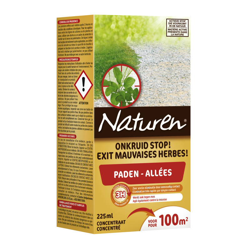 L'Exit Mauvaises herbes vous permet d'éliminer la mousse, ainsi que les jeunes mauvaises herbes sur votre terrasse et dans vos allées. Une boîte a une contenance de 0,225 L, ce qui permet de traiter une surface de 100 m².