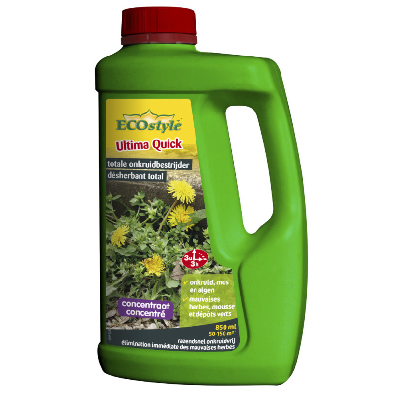 Le désherbant et anti-mousse concentré Ultima Quick est une solution liquide conçue pour le contrôle des adventices sur les surfaces non cultivées. Sa formulation à base d'acide pélargonique, une substance active d'origine naturelle, lui confère une action rapide et une biodégradation accélérée dans le sol. Ce produit s'emploie après dilution pour le traitement des terrasses, allées et autres espaces pavés.