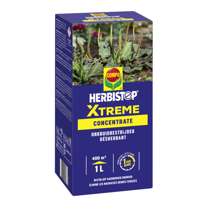 Le désherbant Herbistop Xtreme concentré de Compo est formulé pour une action rapide et totale. Sa très forte concentration de matière active permet une destruction efficace des graminées annuelles et des dicotylées annuelles. Ce produit est spécifiquement conçu pour un usage entre les rangs de plantes ornementales, d'arbres, d'arbustes, d'arbres fruitiers et de légumes cultivés en plein air. Il offre également une solution pratique en préparation des sols avant tout semis ou plantation.