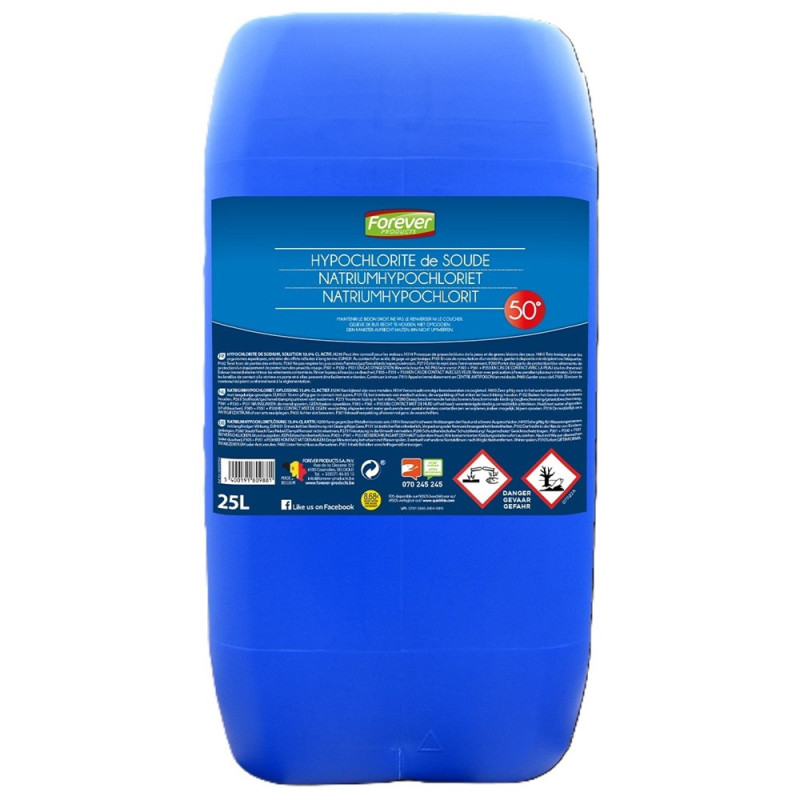 Idéal pour nettoyer, l'hypochlorite de soude 50° de la marque Forever est contenu dans un récipient de 25 L.