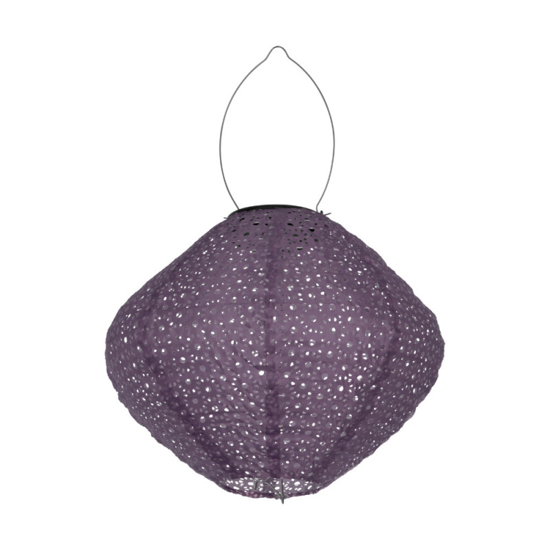 - Son design lilas avec motifs perforés diffuse une lumière tamisée et décorative, servant à la fois de source lumineuse et d'élément d'ornement.