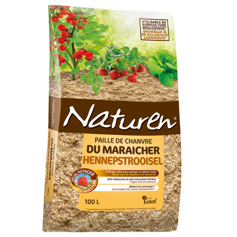 La paille de chanvre NATUREN, issue du teillage, constitue un paillage organique 100% naturel pour potager et massifs. Conforme à l'agriculture biologique, elle se dégrade en enrichissant durablement la terre de matière organique.